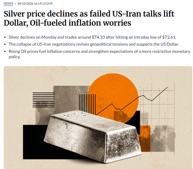 Technical Scoop: Inflation Up, Oil Low, Gold Base Silver is at downtrend line resistance and approaching the 50-day MA at $80. Above $80 and especially over $90 things are looking up again. David Chapman Mon, 04/13/2026 – 09:03